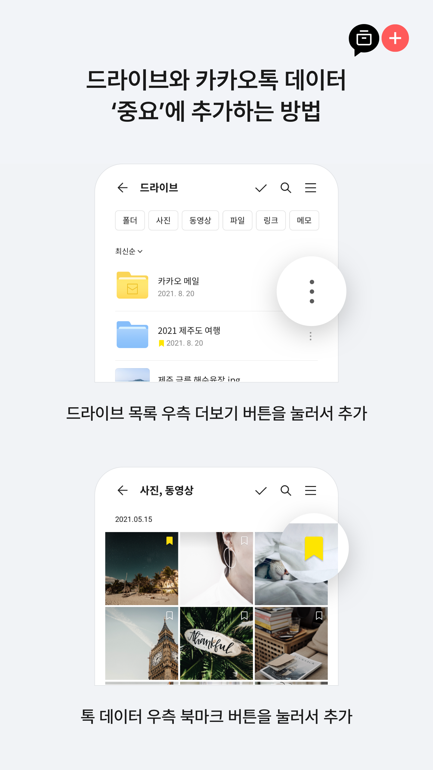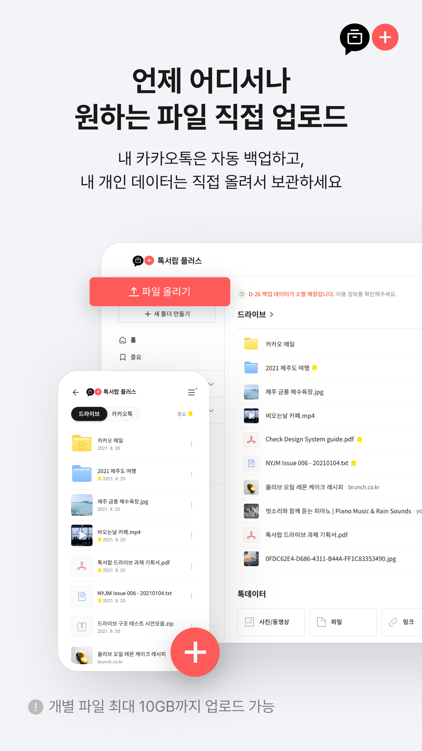 기존에는 오직 카카오톡 대화방 내의 사진이나 동영상, 파일 등의 데이터만 자동 백업되었다면, 이제는 구글 드라이브, 네이버 클라우드처럼 직접 파일을 업로드할 수 있습니다.