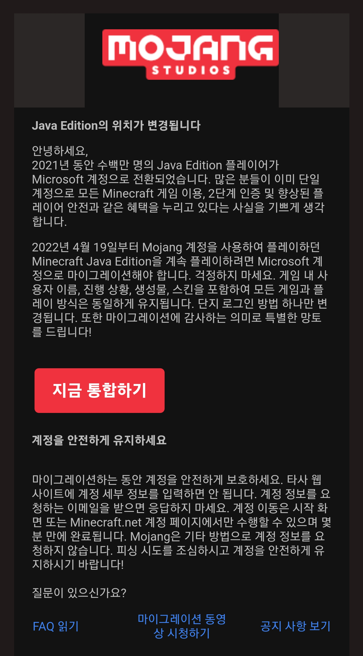 마인크래프트 자바 에디션 유저는 기존 모장 계정을 마이크로소프트 계정으로 통합(마이그레이션)해야 합니다.