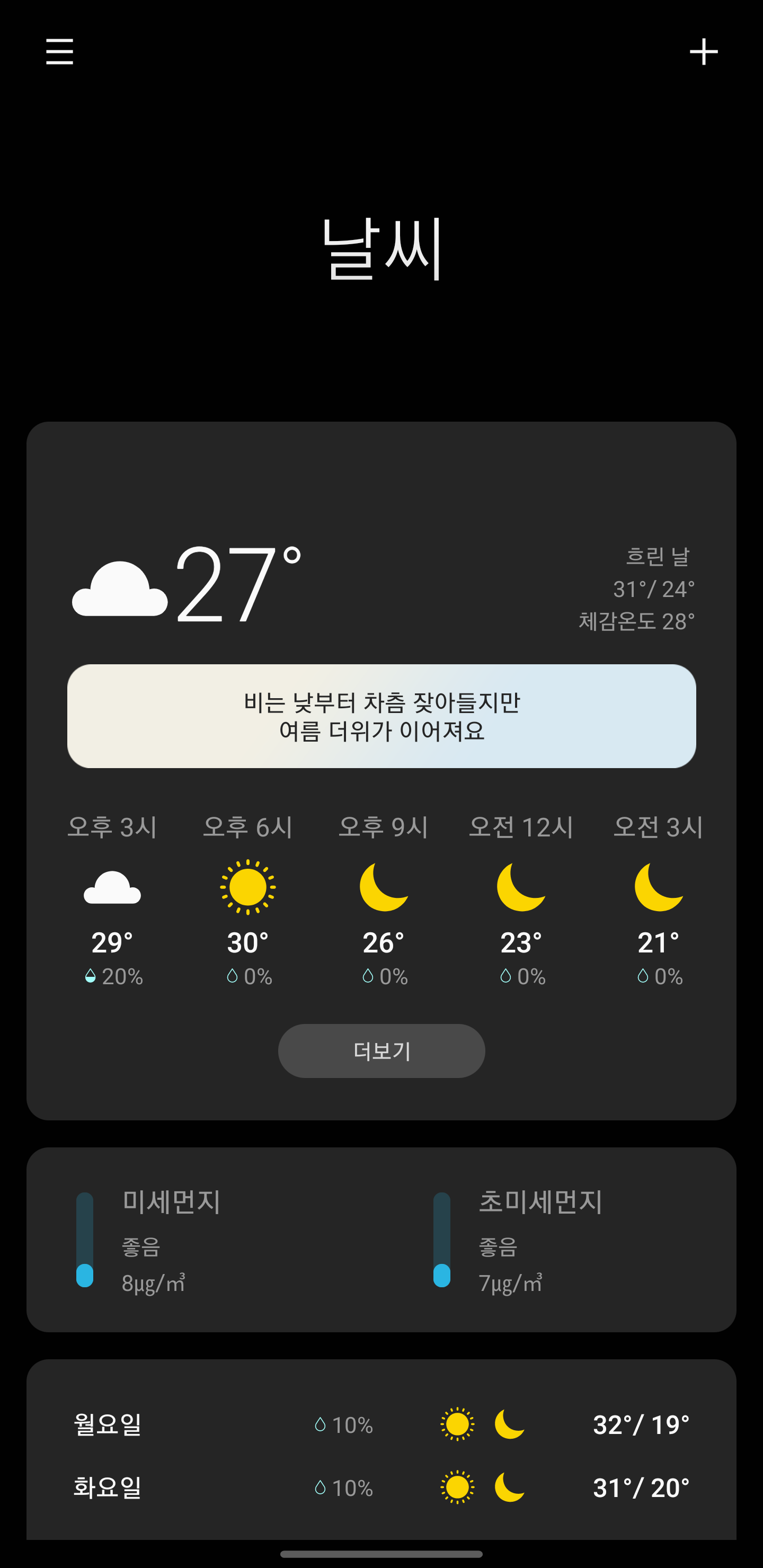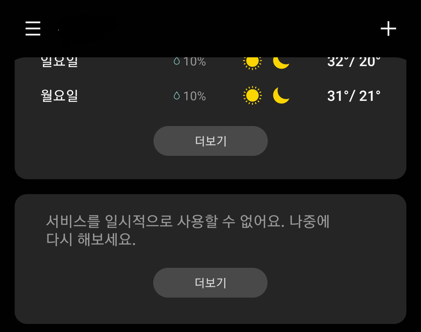 요일별 날씨 밑에 "서비스를 일시적으로 사용할 수 없어요."라고 뜨는 것은 무시하셔도 됩니다.