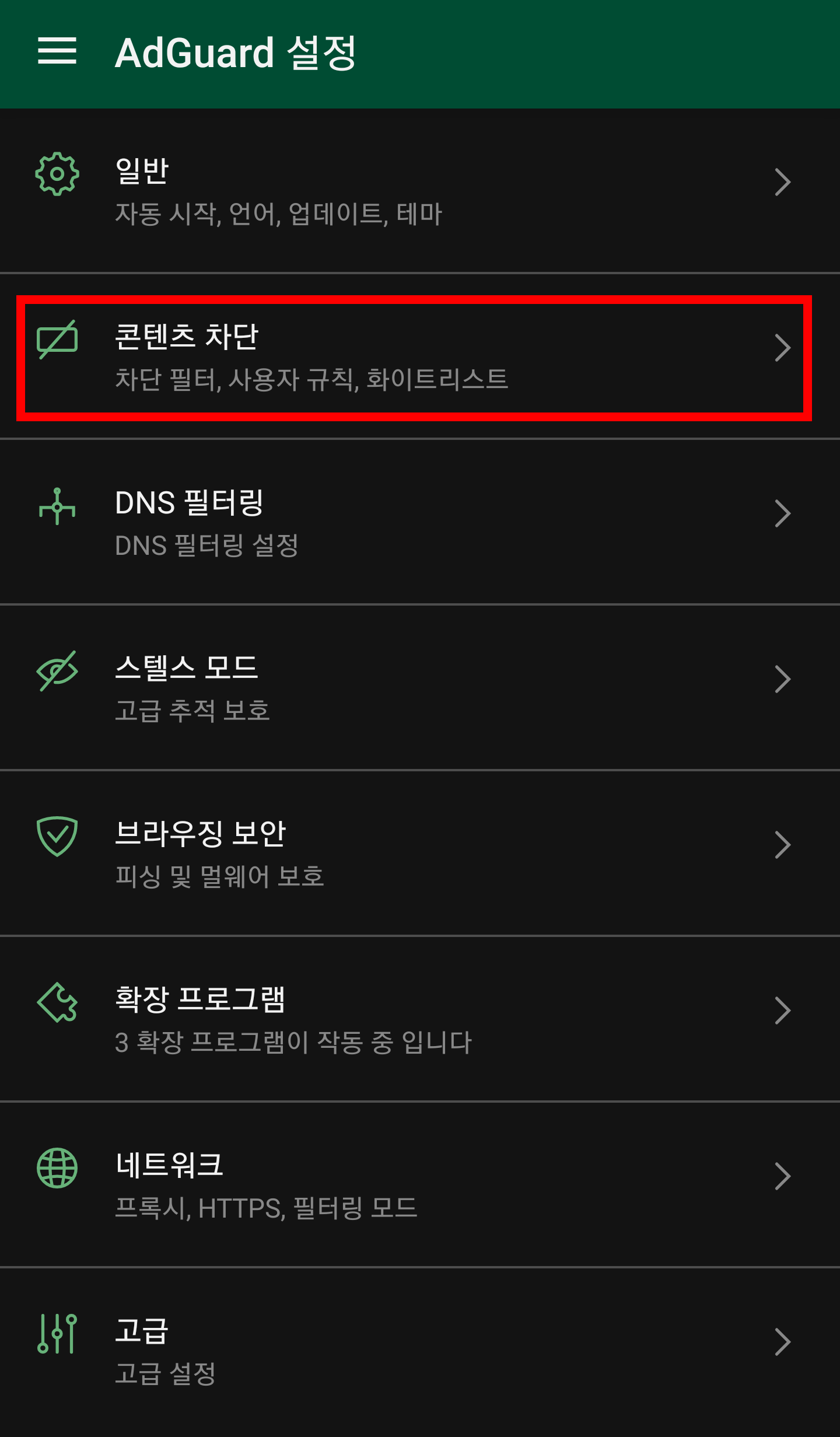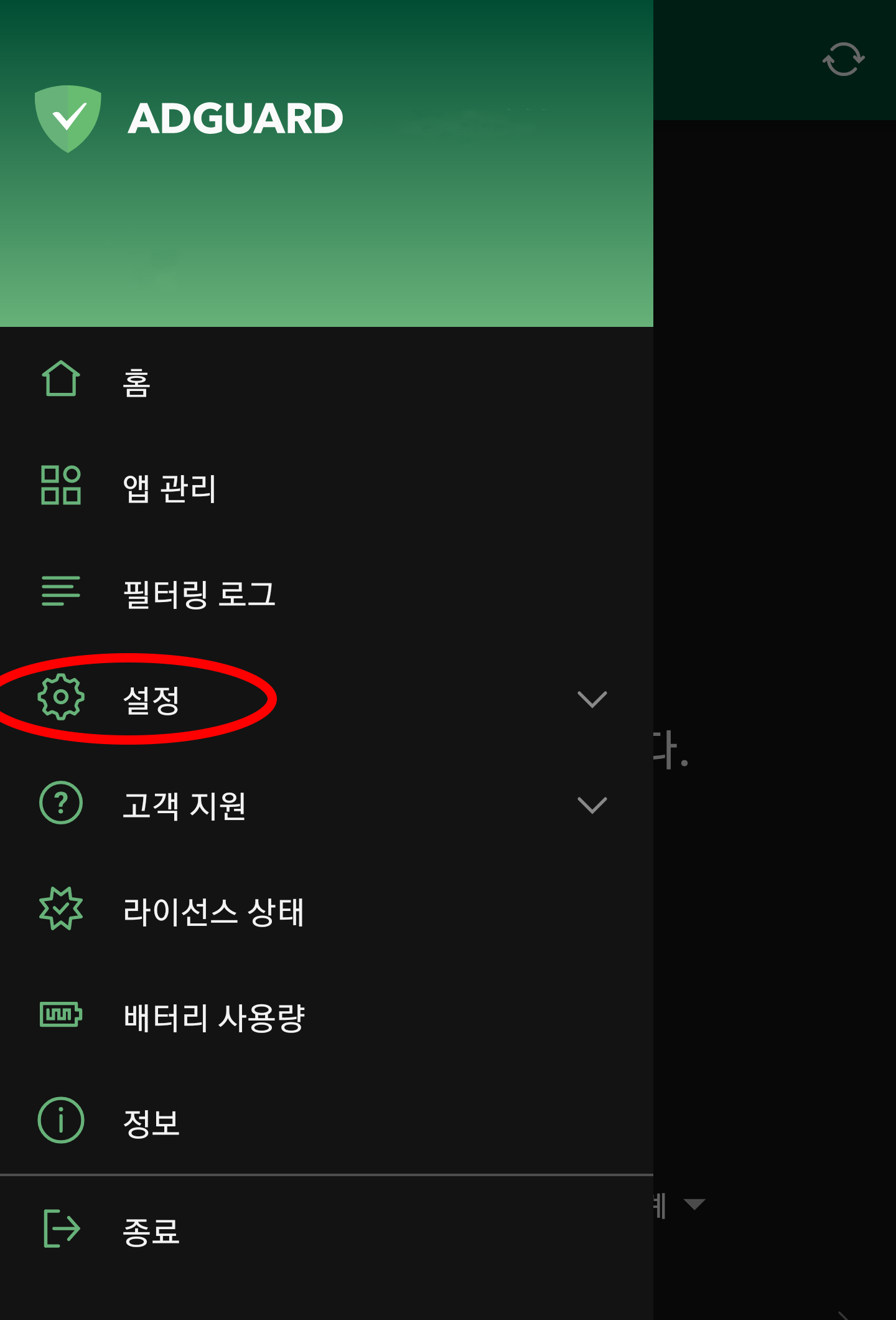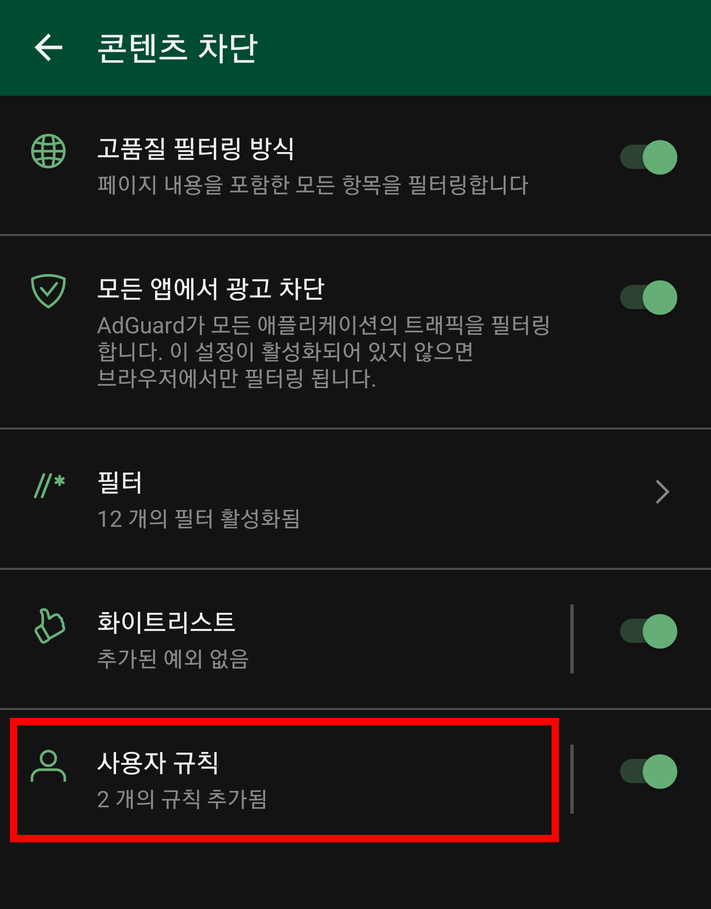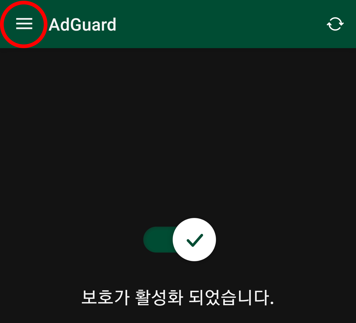 그럼 다시 AdGuard 앱 메인 화면으로 돌아와서 AdGuard가 활성화 되어 있는지 확인하고,