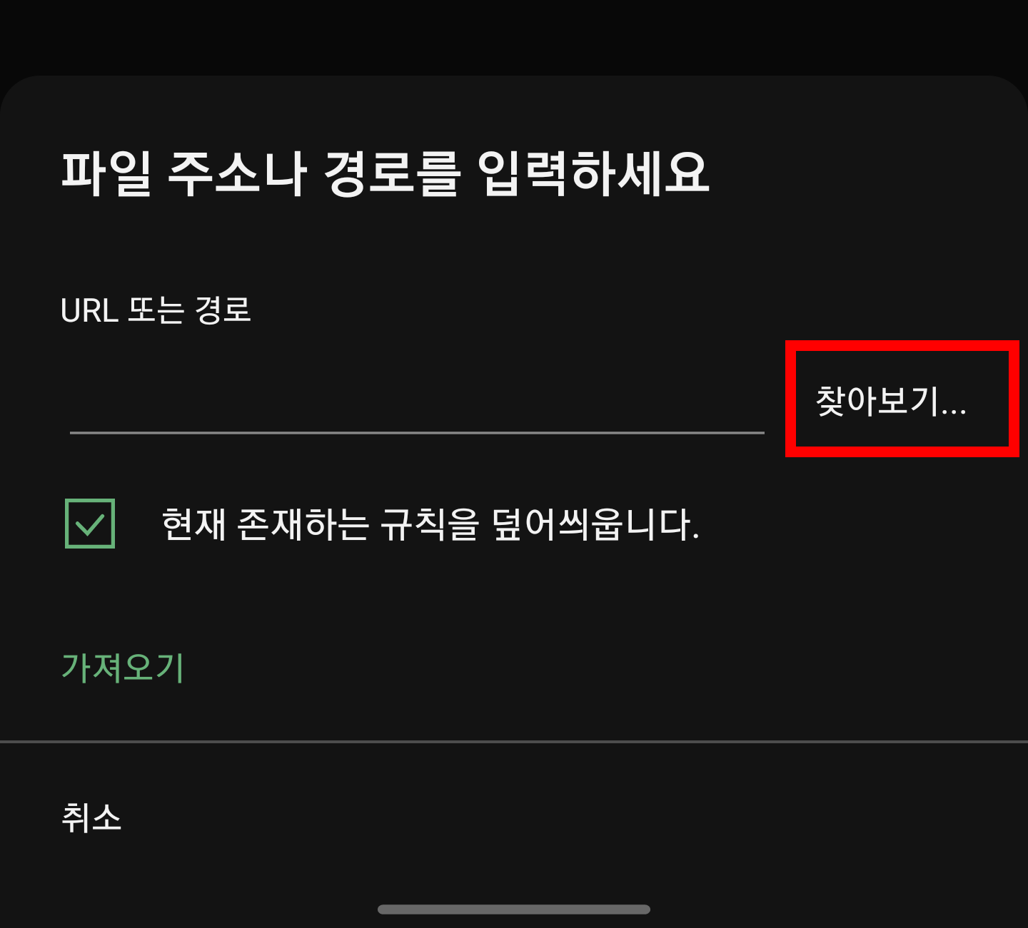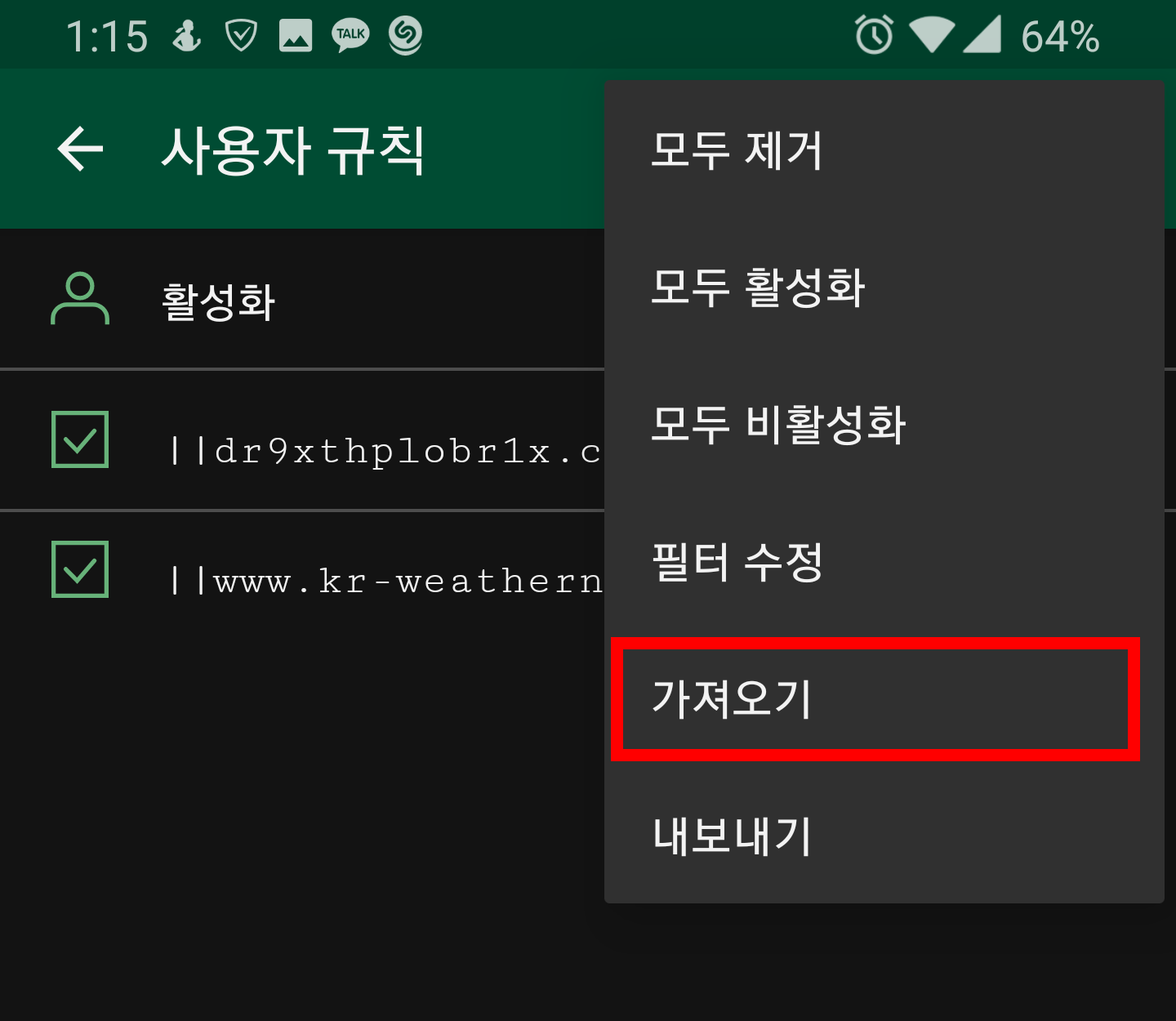 사용자 규칙에 들어가서 "가져오기"가 아닌,