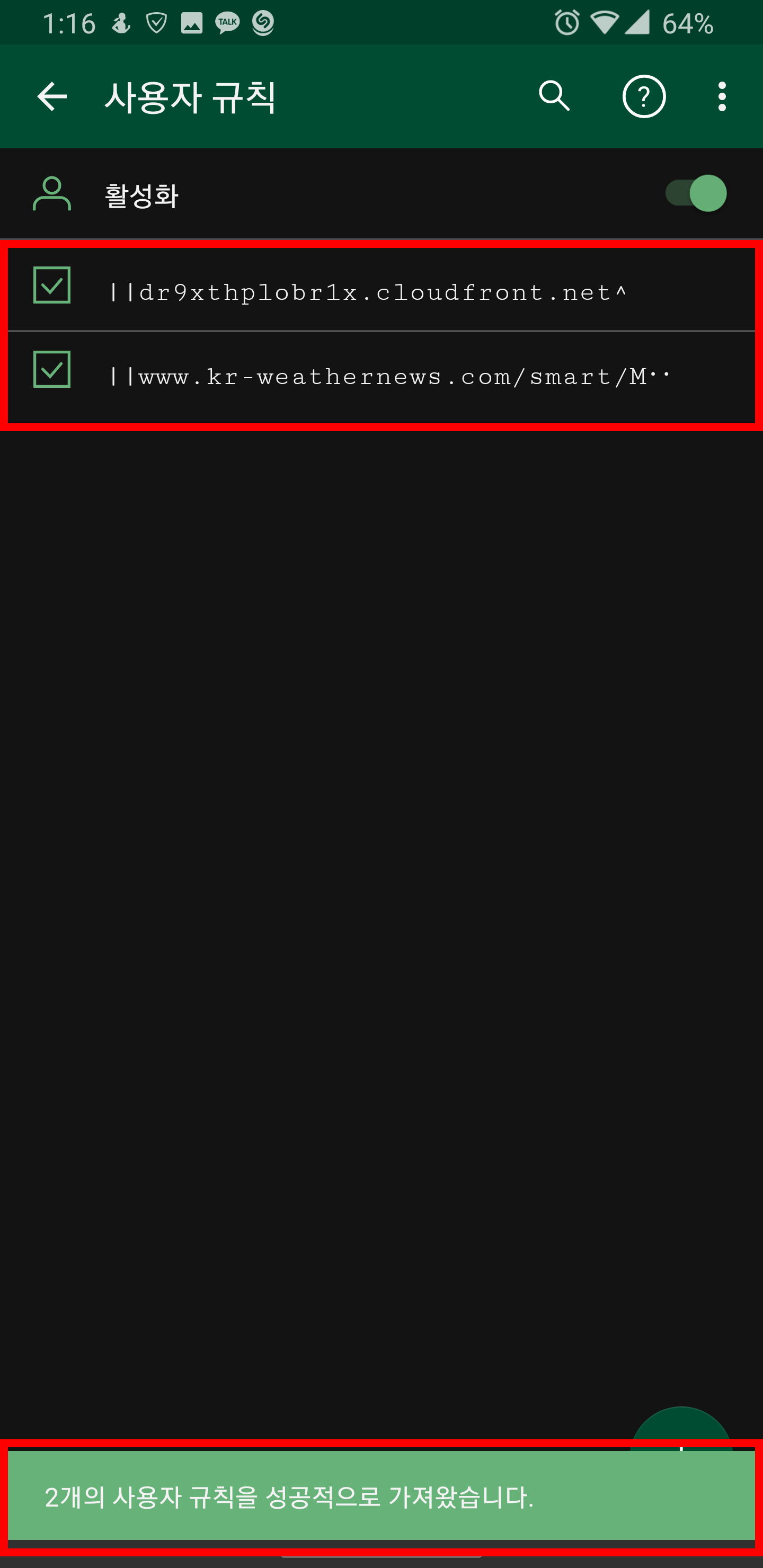 "2개의 사용자 규칙을 성공적으로 가져왔습니다."라는 문구가 뜨고 위에 제대로 추가가 됬으면 성공한 것입니다.